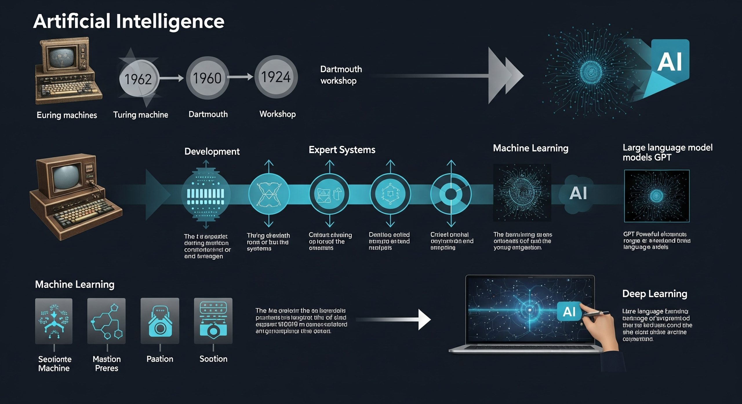دهه ۲۰۱۰ تاکنون: شکوفایی یادگیری عمیق و مدل‌های زبانی بزرگ مانند GPT؛ AI به‌طور گسترده در زندگی روزمره کاربرد دارد.