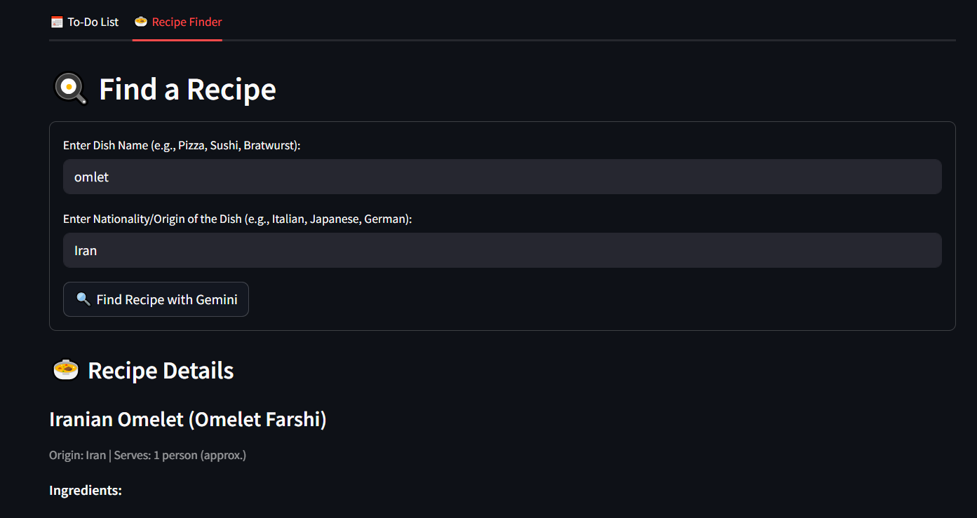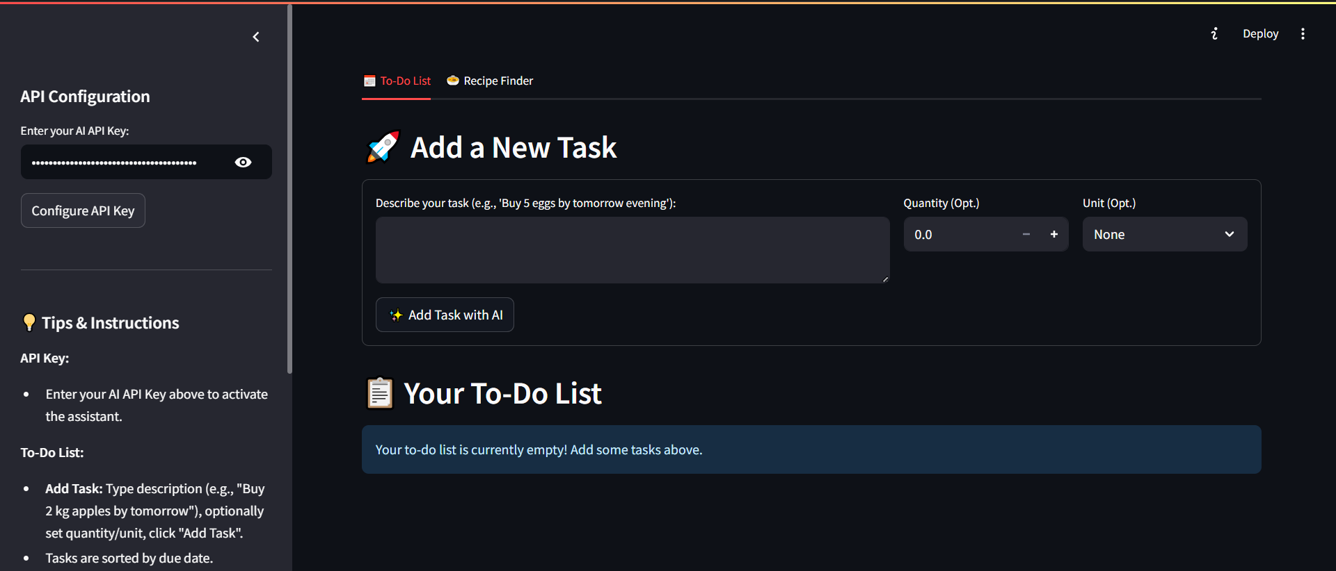 یک دستیار هوشمند مبتنی بر AI API و Streamlit برای مدیریت آسان و هوشمند لیست کارهای روزانه شما از طریق زبان طبیعی و همچنین یافتن سریع دستور پخت غذاهای مختلف بین‌المللی به همراه مواد اولیه دقیق!